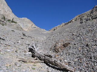 Having reached and crossed the relatively flat basin, it was time to make the final climb to the summit that, in this photo, is further back on the right-hand peak, out of view. It was on this approach that we saw a bighorn sheep, across the way, on the ridge of Hidden Peak.