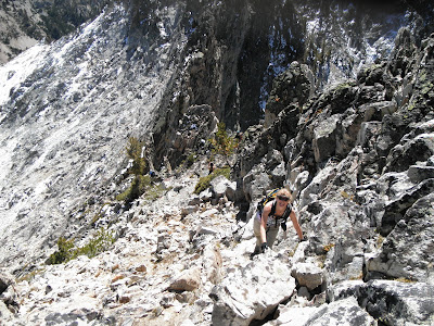El Capitan turned out to be a perfect peak for the 12 that attended. Although it was slightly under 10K, the peak offered a pleasant scenic approach, rock hopping among snow patches, class 3+ scrambling, an exposed final approach ridge, and a rather "airy" summit. We got all 12 mountaineers on top, but it was crowded. With 800+ft drop-offs all around, maneuvering was a careful undertaking, which made it all the better.